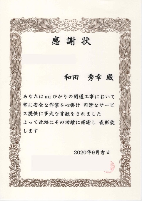 携帯サービスの開通工事において、安全を心がけた円滑なサービス提供を表彰いただきました。